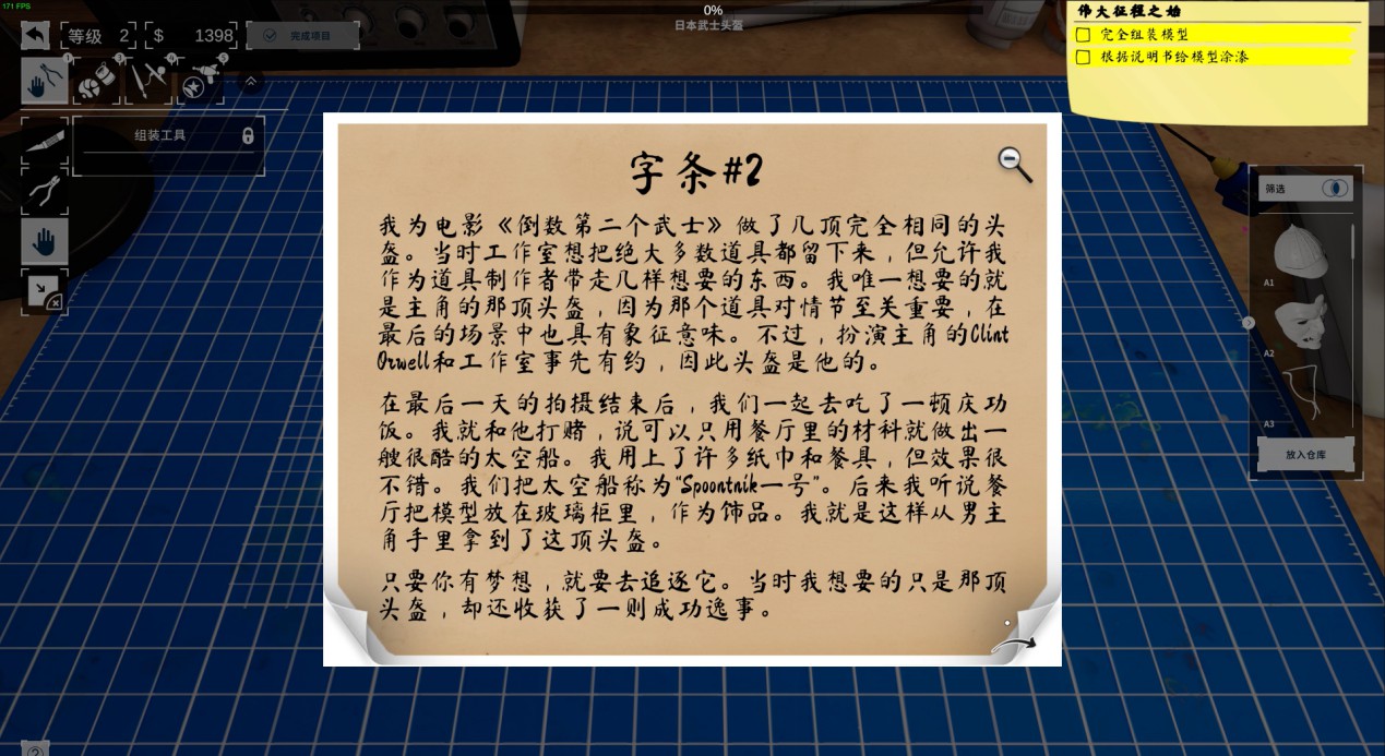 顾名思义,生涯模式中玩家需要扮演一位模型匠人大师的后代,一步步建立自己的工作室并获得丰厚的收入,从菜鸟小白到模玩大师的过程中,与不同客户的对话成为了游戏的主要叙事方式,它们的主题或为友情亲情,或为人生的成长与思考,在一个个短小精悍的对话下,人生百味尽收眼底,其中还有几段关于主角爷爷stan的缅怀叙述颇让人感动。