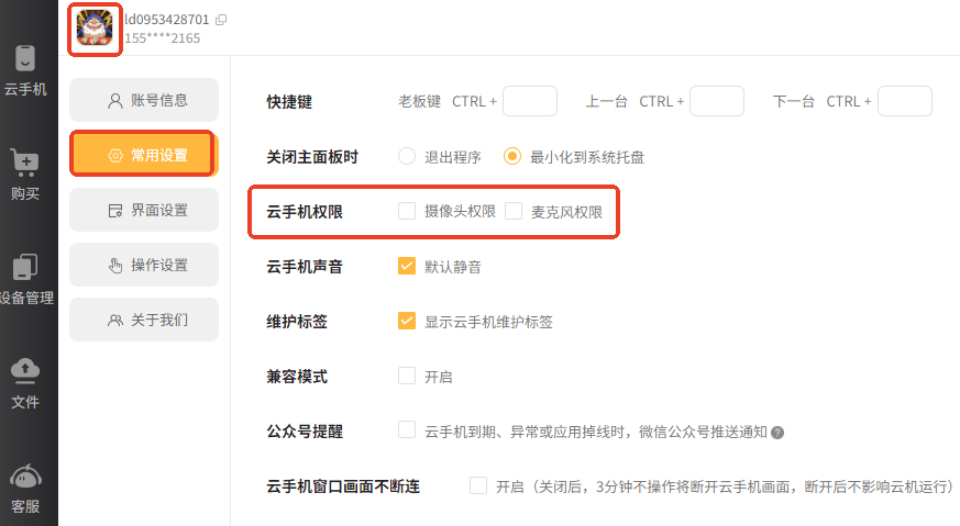 点击头像,然后选择“常用设置”,找到“云手机权限”选择,勾选摄像头权限。