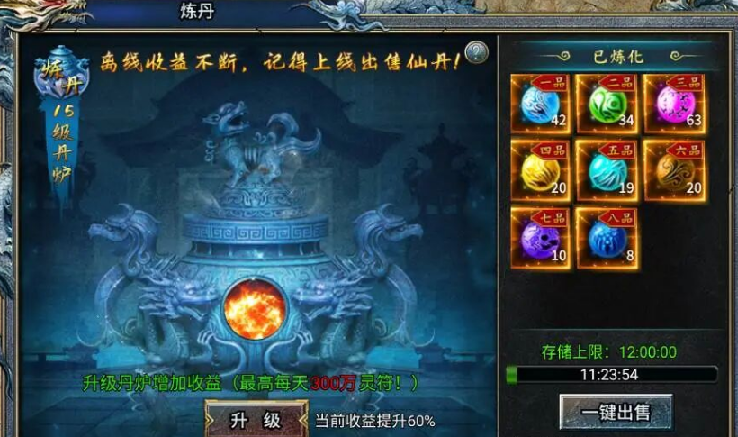 幻世天神前期的灵符可是非常重要的道具,其中一个重要的获取途径就是炼丹。每日挂机即可获取大量灵符,随着人物等级的提高,也可对丹炉进行升级来增加灵符的收益,丹炉最多只能储存12小时的收益。