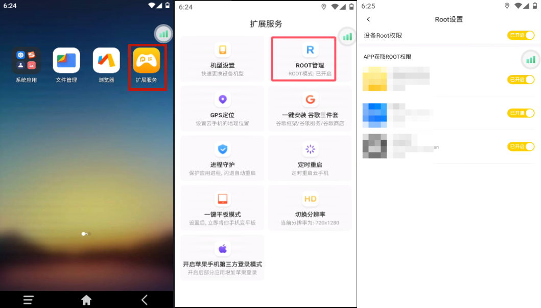 打开“扩展服务”,里面有个“ROOT管理”,点击进入以后,上面设备ROOT权限,开启关闭是控制这台设备的,如果需要单个软件开关root权限的的话则在下面找到对应软件关闭即可