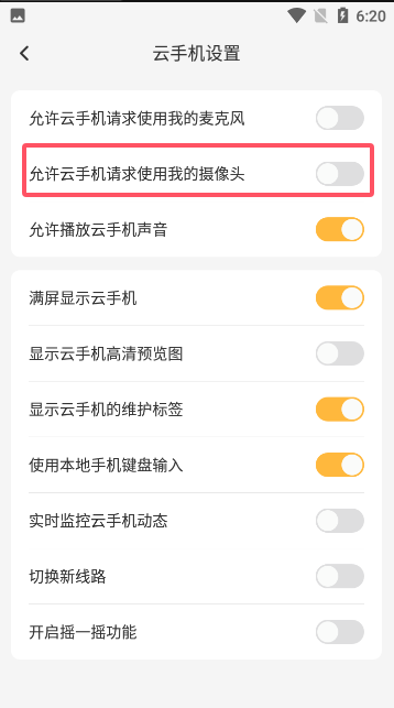 2、找到允许云手机使用摄像头的开关,点击开关会弹出是否授权云手机使用摄像头的选项,点击确定即可。(有些会直接跳转自己手机上的“应用信息”界面,在这个界面找到带有“权限”二字的地方,然后点击进去找到“相机”或者“摄像头”之类的选项给与权限即可)