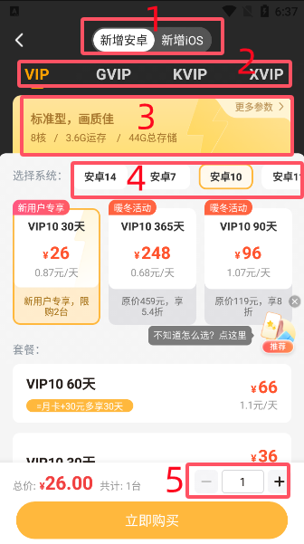 1、云手机系统类型选择,可以选择安卓系统的云手机也可以选择ios系统的云手机