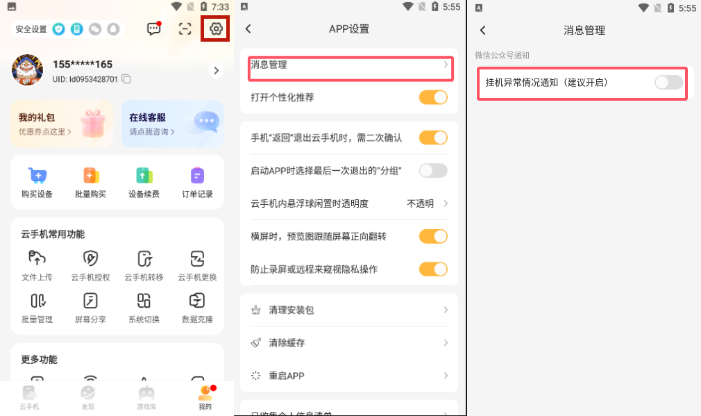 1、后点击右上角齿轮,进去以后点击“消息管理”,然后开启“挂机异常情况通知”