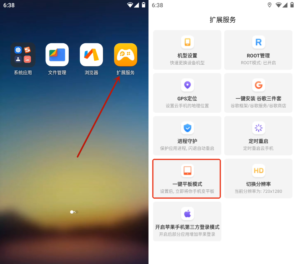 点击“扩展服务”,找到其中的“一键平板模式”(在平板模式下显示为“恢复手机模式”),点击以后会提示需要重启云手机,点击确认即可,重启后生效。