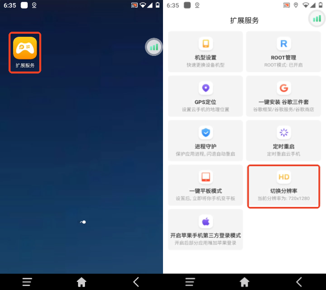 1、点击“扩展服务”,然后往下面翻,找到“切换分辨率”点击
