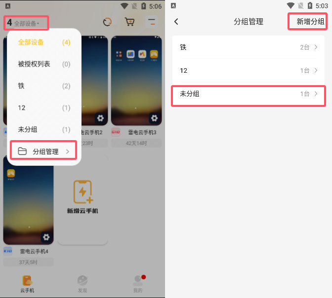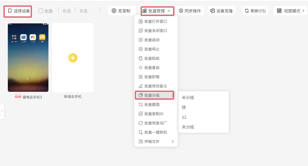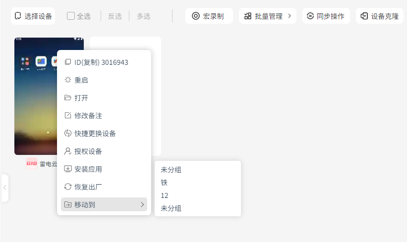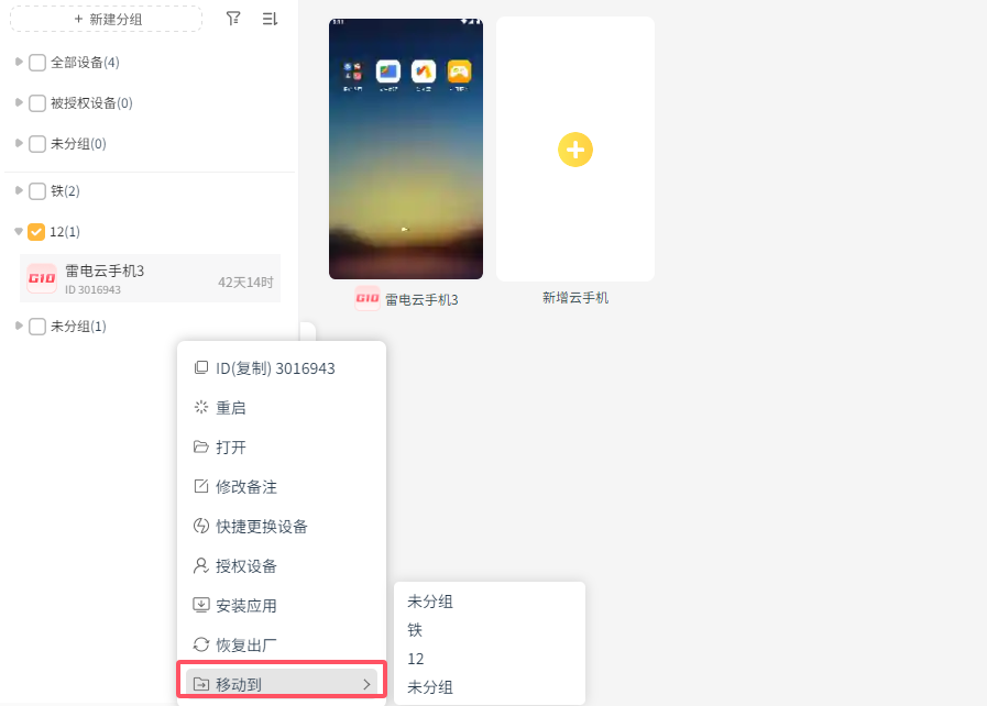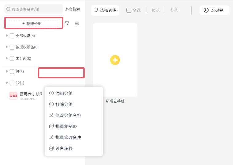 鼠标移动到对应分组右边空白位置右键点击,既可增加分组、移除分组、修改分组名字等操作(雷电云手机的自带分组是无法删除的,右键会没有反应,只有自己创建的分组才能有对应的操作,没反应的时候看下是不是点错位置了)。