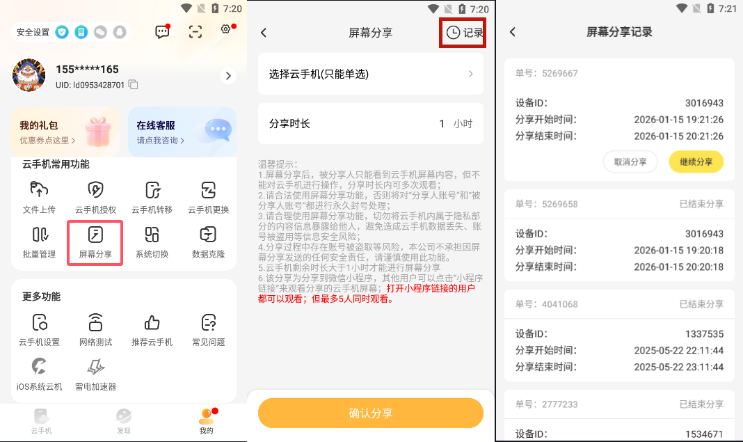 1、在设备界面找到“屏幕分享”,或者在“我的”界面找到“屏幕分享”,然后设置好要分享的设备点确定(可直接分享云手机给微信朋友进行观看,分享时长为1小时,一台云手机可同时分享给5个人进行观看。)
