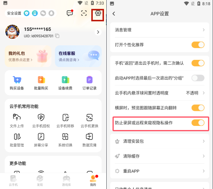 点击“我的”界面的右上角的齿轮状图标,进入app设置,然后选择关闭“防止窥屏或远程来窥视隐私操作”既可,这个功能是默认开启的,如果碰到无法截图的情况可以先看下此功能是否关闭了。