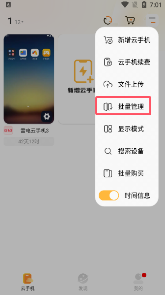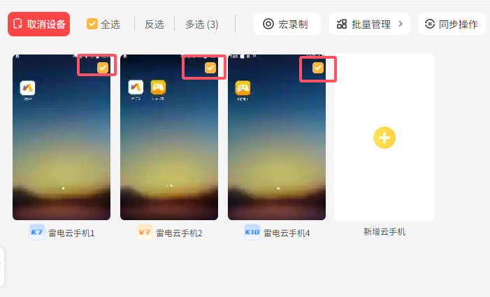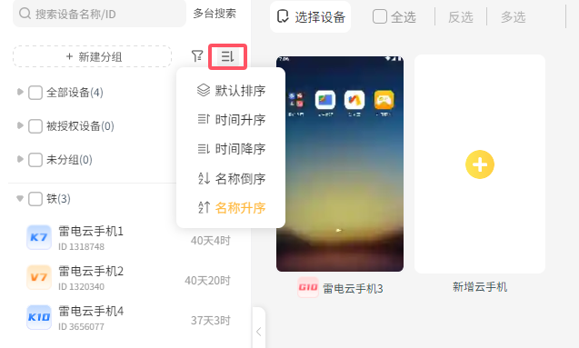 雷电云手机缩略图展示界面的排序没改备注的时候会默认排序。修改备注以后会按数字、字母、文字等顺序进行排序。