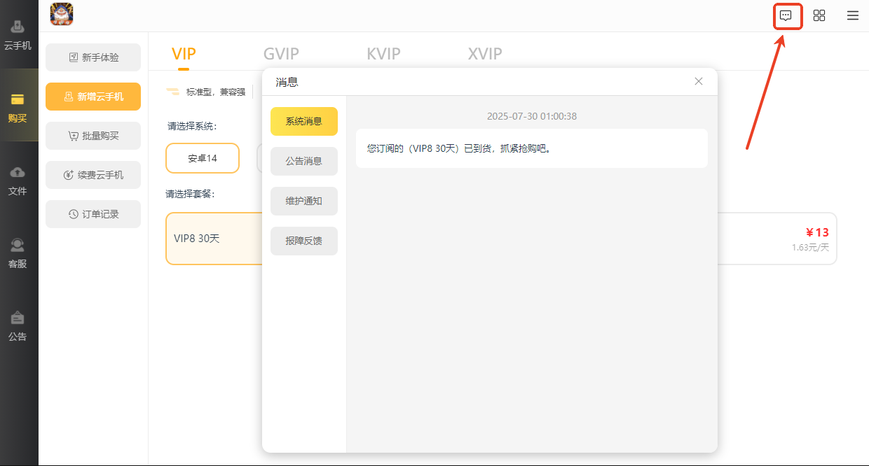 现在雷电云手机设备到货通知功能已经上线,设置以后到货的第一时间就会通知大家,方便大家及时购买自己需要的设备。