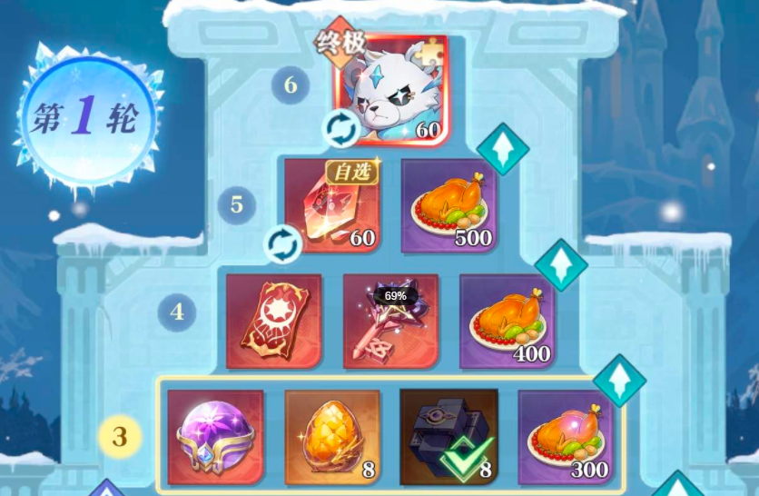 1、抽奖次数在8次以内每次需要一枚魔龙灵石,9-16次每次抽取需要2枚魔龙灵石,16次数以上则需要3枚魔龙灵石,每层抽中奖励后会下降一层,抽到上升选项会上升一层,如此反复,想要抽到最终奖励,大部分都是需要把每层奖励全部抽取完毕,则大约需要抽取27次,总计大约需要57张暖冬入场券就可以保底获得最终奖励。运气还可以大概51张暖冬入场券也能拿到最终奖励。