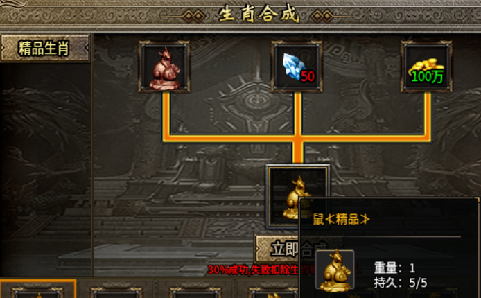 4、精品生肖:高级生肖+50生肖精魄+100万金币,二大陆合成(30%成功率,失败仅扣材料),全套攻魔道+5%、HP/MP+5%、全技能伤害+5%;